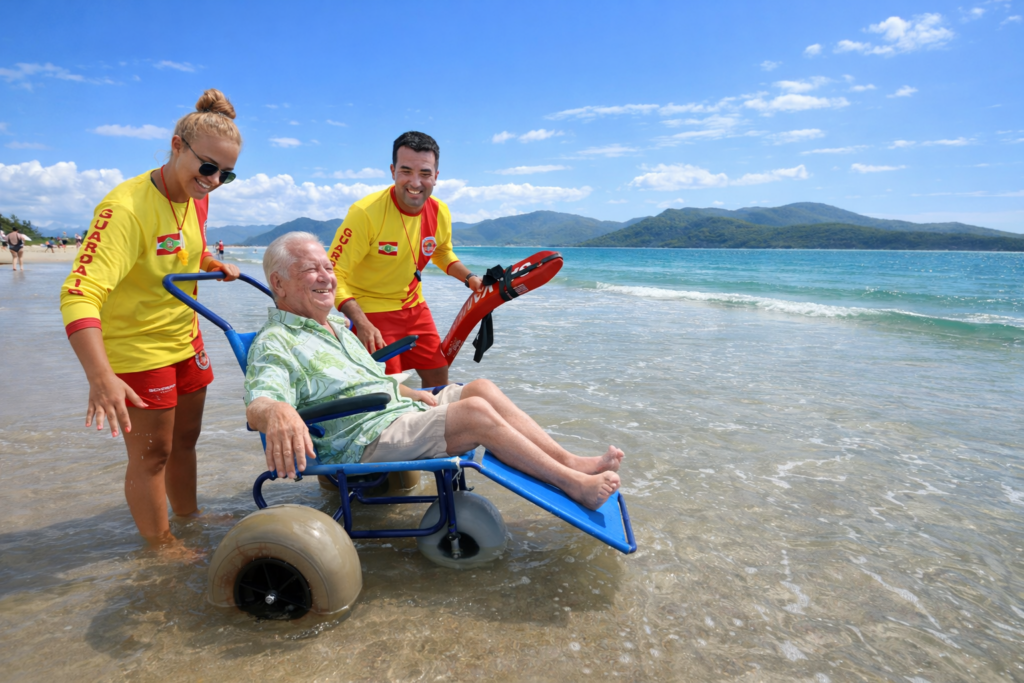 Um dos exemplos mais emblemáticos dessa abordagem em Florianópolis está nas praias acessíveis, com o uso de cadeiras anfíbias. A iniciativa permite que pessoas com deficiência ou mobilidade reduzida vivenciem o mar de forma segura e assistida, transformando um espaço historicamente excludente em um ambiente de pertencimento.